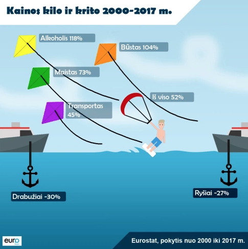 Ar žinai, kad kainos Lietuvoje nuo 2000 m. iki 2017 m. pakilo 52 proc.? Tai yra daugiau nei Europos Sąjungos vidurkis (36,5 proc.), bet daug mažiau nei kainų skrydis Rumunijoje (257 proc.), skelbia „Eurostat“.
